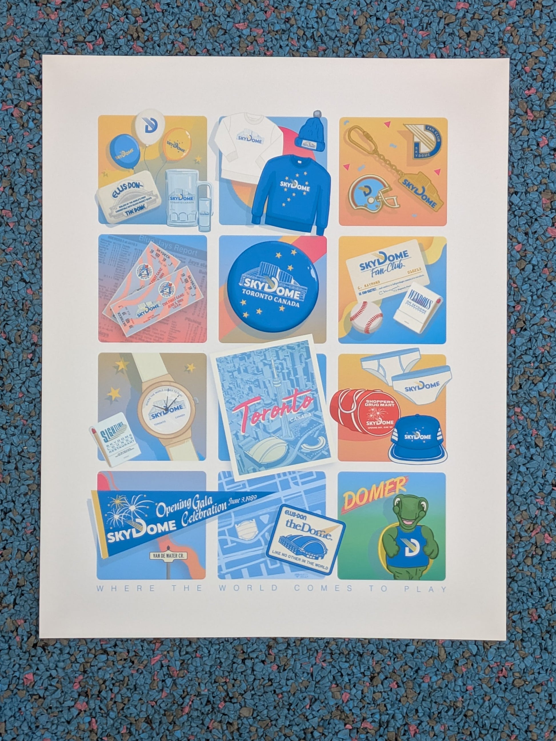 This is a print featuring a grid of memorabilia from the opening of Skydome in 1989